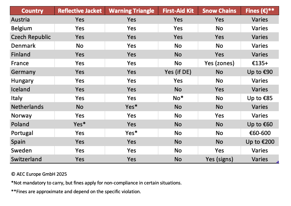 Traveling by car in Europe offers the freedom to explore diverse landscapes, from picturesque countryside roads to bustling cityscapes, and all at your own pace. It’s an adventure that promises discovery, but it also comes with responsibilities. Each country has specific regulations for mandatory items drivers must carry, and these requirements are in place for a reason.